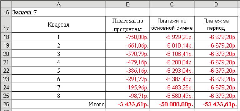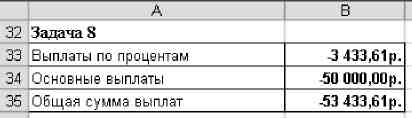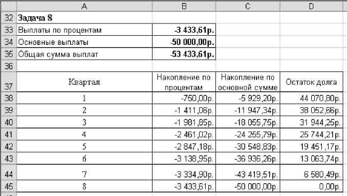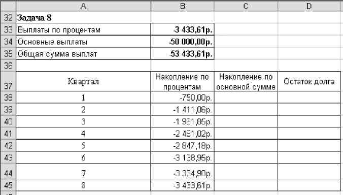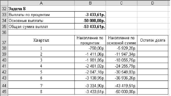 Вычислите величину выплаты по процентам с помощью функции CUMIPMT, используя необходимые значения из условия задачи 6 и указав в качестве начального и конечного периодов соответственно 1 и 8 квартал.