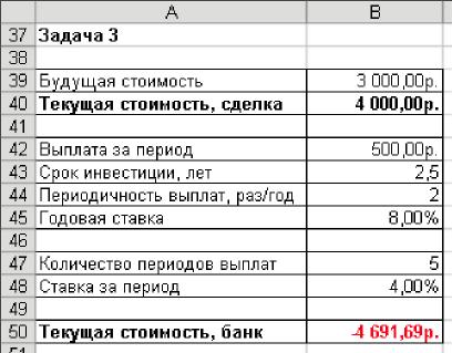 Функция возвращает значение -4 691,69. Это означает, что нужно вложить в банк 4 691,69р. под 8,0% годовых. Поскольку значение 4 691,69р. больше, чем текущая стоимость сделки (4 000р.), вложить деньги в сделку более выгодно, чем в банк.