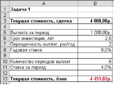 Функция возвращает значение -4 451,82. Это означает, что нужно вложить в банк 4 451,82р. под 8,0% годовых сегодня, чтобы получить 5 000р. в течение следующих 5 лет. Поскольку в предлагаемой сделке вклад равен 4 000р., можно считать, что совершить сделку выгоднее, чем вложить деньги в банк.